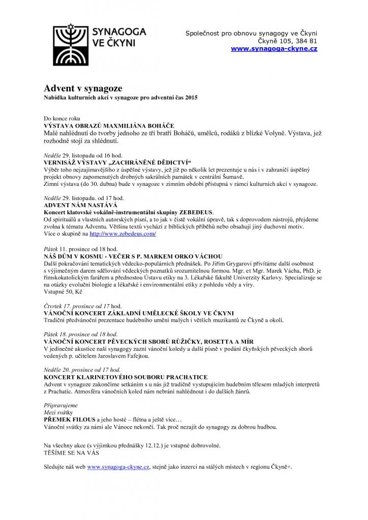 Přijďte o Adventu do synagogy. Setkáme se při výstavách, poslechu hudby, zpěvu i večeru s přednáškou.