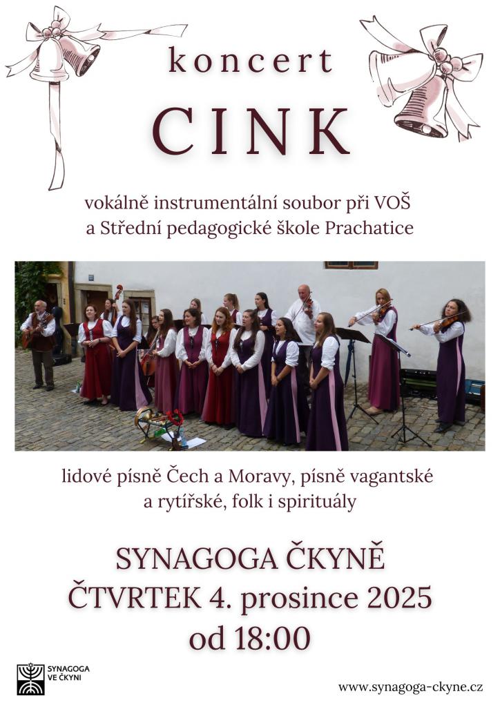 Ve ČTVRTEK 4. 12. od 18:00 Vás zveme na KONCERT vokálně instrumentálního souboru při VOŠ a Střední pedagogické škole Prachatice CINK. Uslyšíte písně lidové, vagantské, rytířské, folk i spirituály.